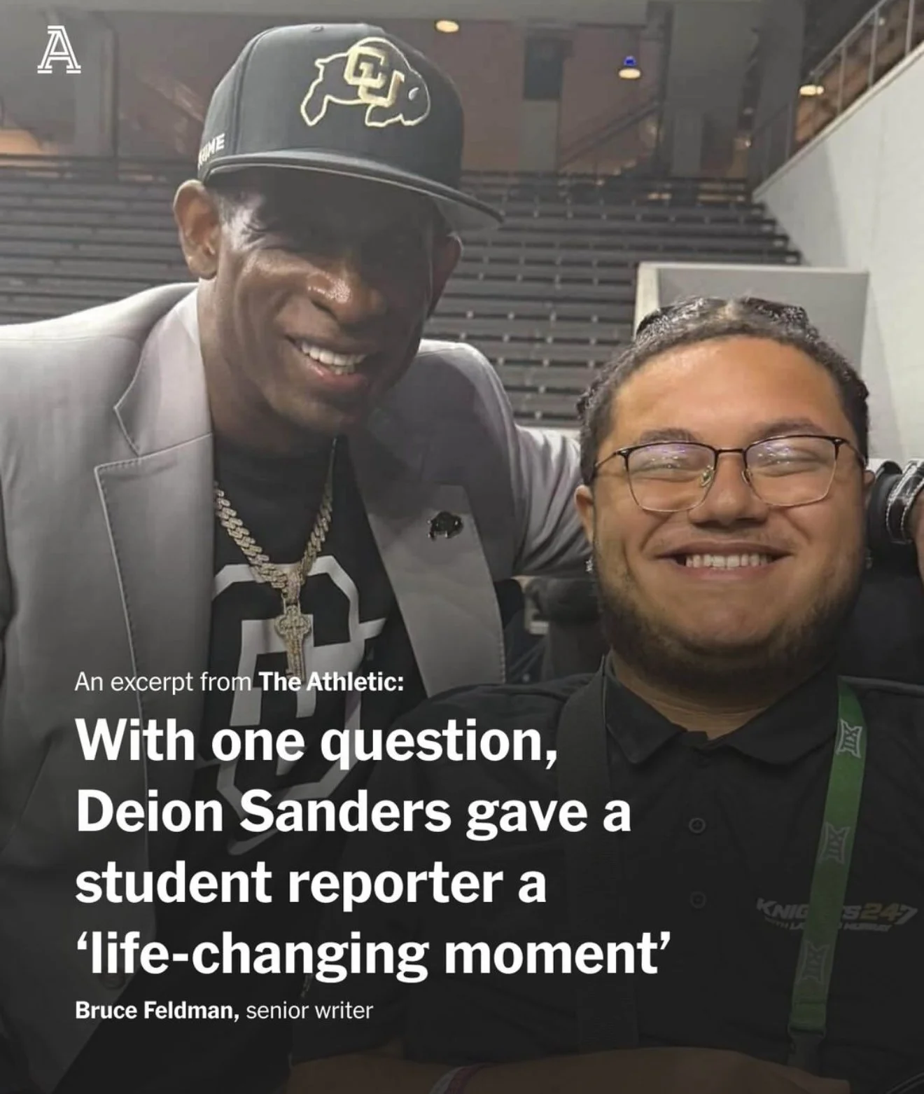 Photograph of Deion Sanders, a former football player, wearing a gray suit, black t-shirt with a gold chain, and a black cap with a logo, standing next to a man with glasses and a black shirt, both smiling. The background shows seating in an indoor stadium or arena. Text overlay discusses Sanders giving a student reporter a life-changing moment.
