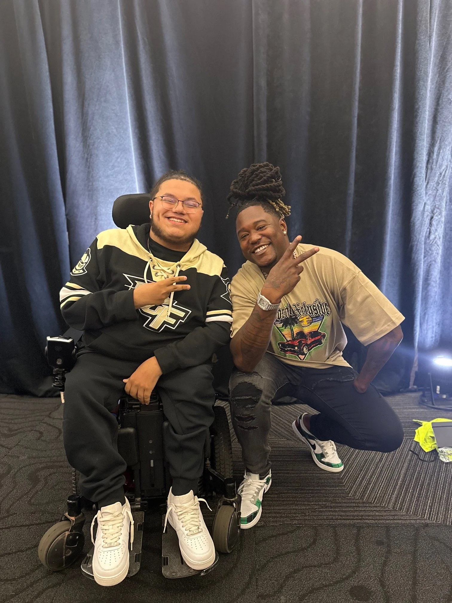Two young men smiling and posing with peace signs in front of dark curtains, one seated in a wheelchair, both wearing casual streetwear.