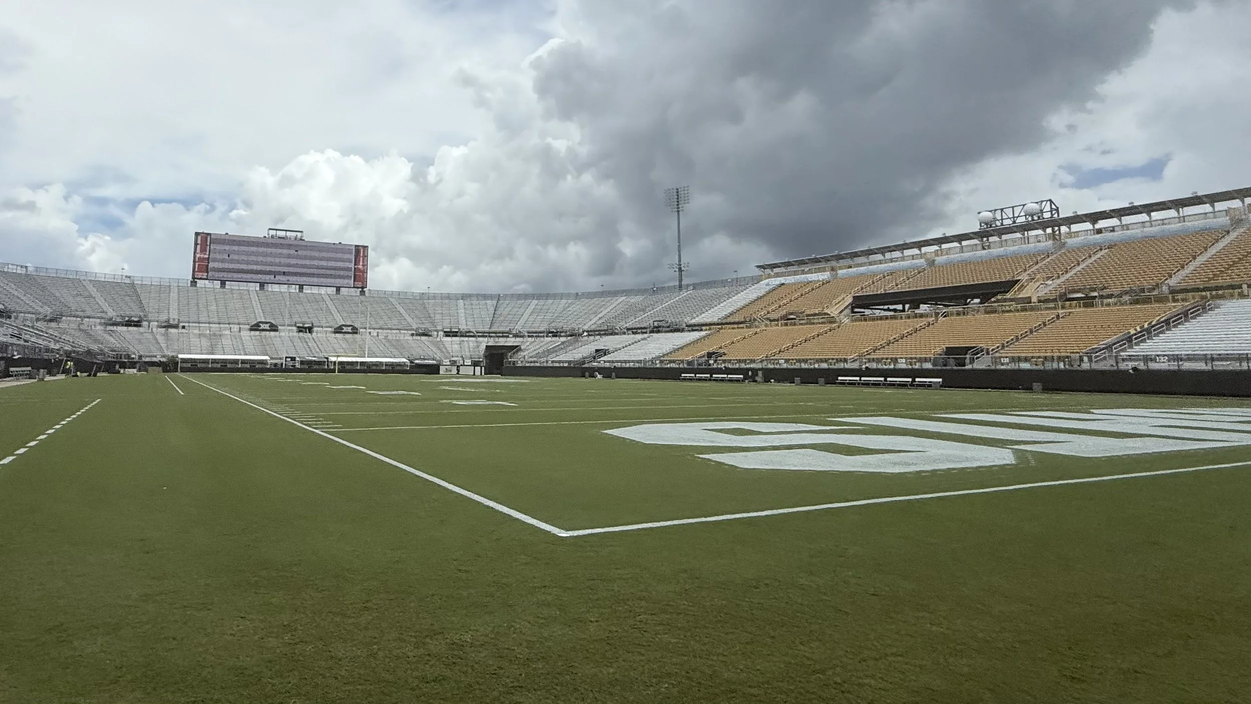 Empty [UCF] football stadium with green field, white lines, and a large digital scoreboard in the background, under a partly cloudy sky.
