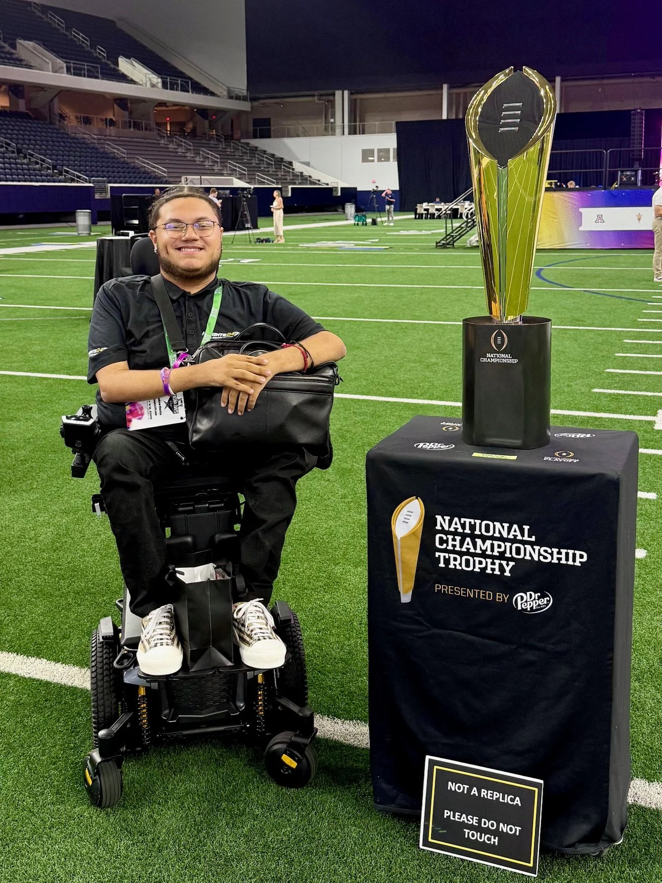 A young man sitting in a motorized wheelchair on a football field, smiling, with a large National Championship Trophy on a table beside him, under stadium lights at night.